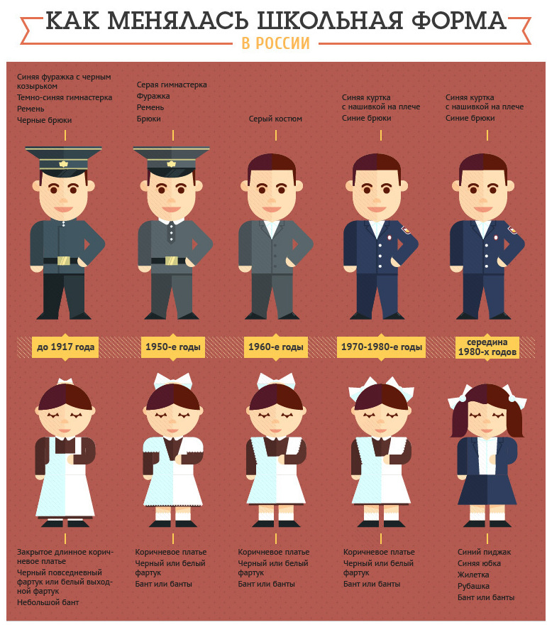В 1949 году правительством был издан указ о введении единой формы для учащихся: девочки носили коричневые шерстяные платья с черными передниками, мальчики – военные гимнастерки с воротником-стоечкой. В дальнейшем, через каждых десять лет она обновлялась, в зависимости от стандартов и моды.